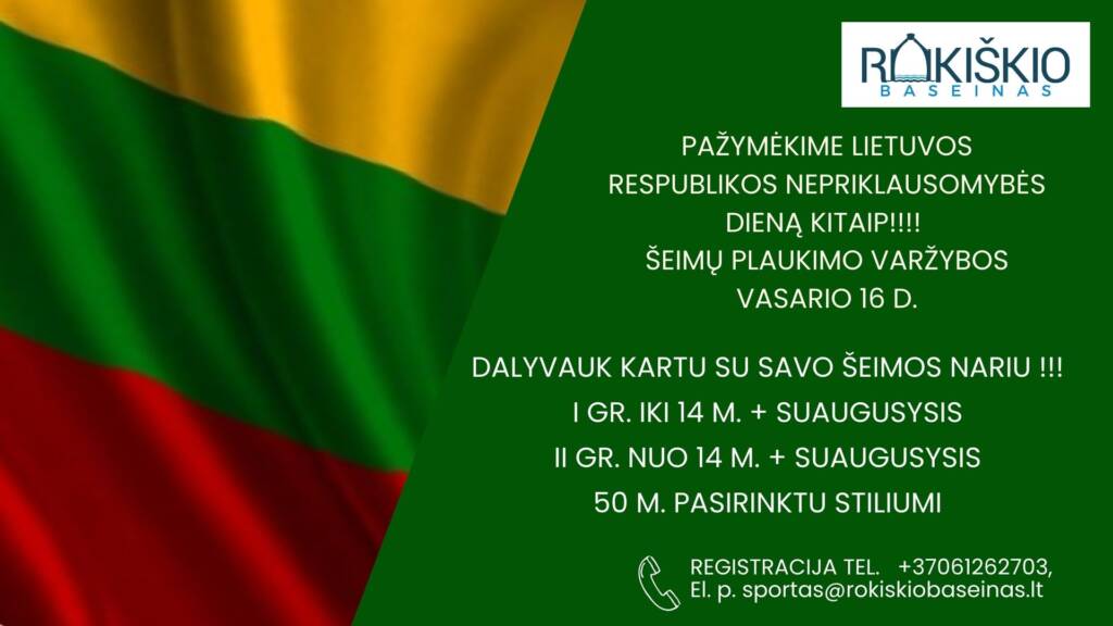 Šių metų vasario 16 d. Rokiškio baseine vyks šeimų plaukimo varžybos, kuriose kviečiame dalyvauti visus vaikus kartu su tėveliais ar seneliais. Varžybų pradžia 12.00 val. Mielai kviečiame atvykti pasižiūrėti varžybų ir palaikyti savo plaukimo duetus. Renginys – nemokamas. Laimėtojų laukia apdovanojimai: taurės ir medaliai. Varžybų dalyviai skirstomi į dvi amžiaus grupes. Plaukimas – 50 metrų, pasirinktu stiliumi.